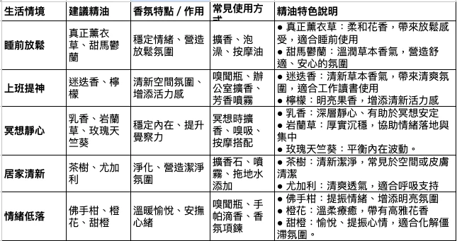芳香療法的魅力,在於它貼近生活、彈性多元。我們可以依照個人不同需求與場域,選擇合適的香氣來支持當下的狀態: