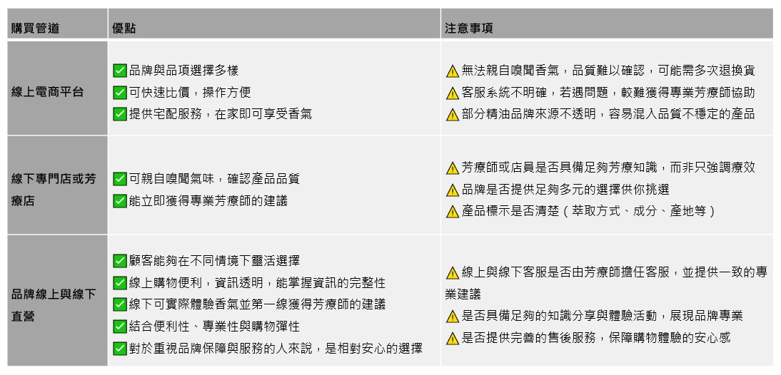 市面上的精油購買管道相當多元,從線上的大型電商平台、專門的芳療或精油店面,到品牌線上與線下直營的門市,每一種管道都各有其優勢與風險。對消費者而言,最重要的是在購買前能夠有意識地分辨與挑選。