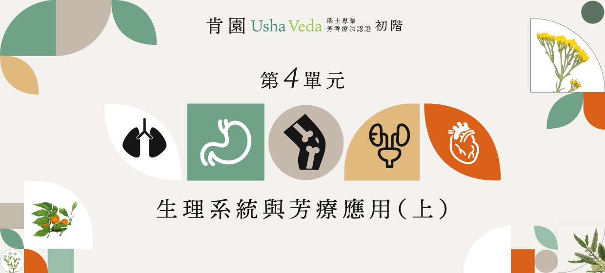 瞭解人體五大系統,包括:呼吸、消化、肌肉骨骼、泌尿、心循環;並整合芳療知識,能夠針對這些症狀給予適合的芳療建議。