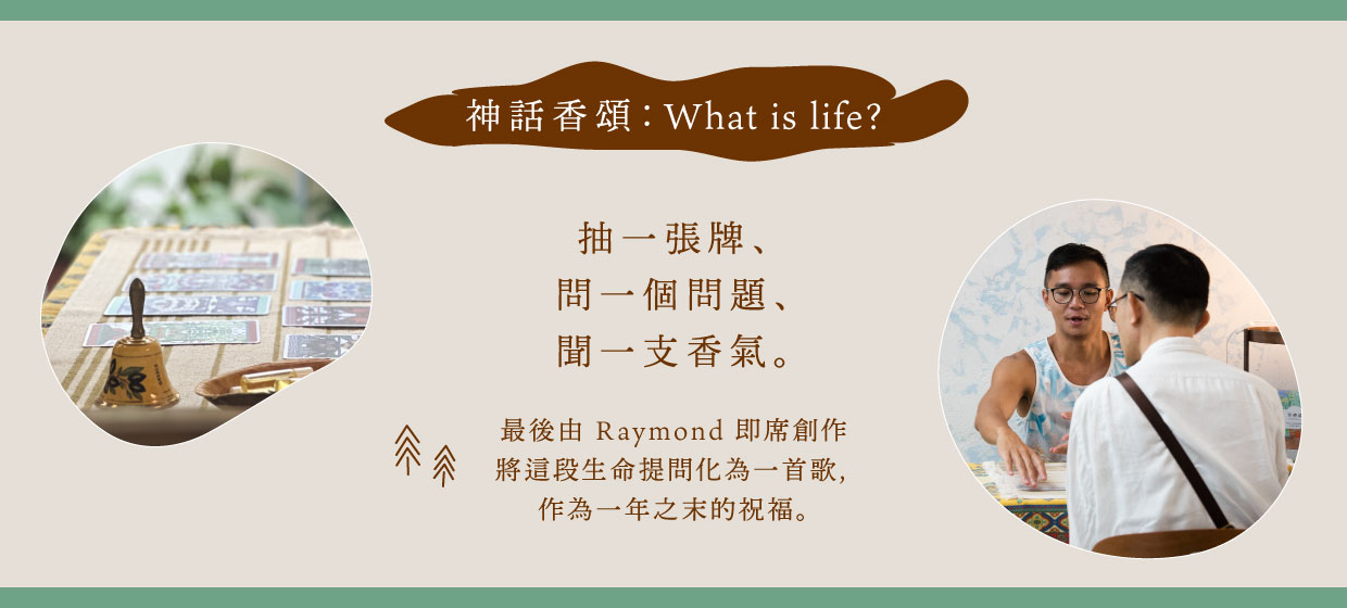 在30分鐘的對話裡,你以生命難題叩問,而我們回報以香氣與歌,透過你所選擇的神話牌卡與香氣,用即席創作的音樂詩歌作為應答。