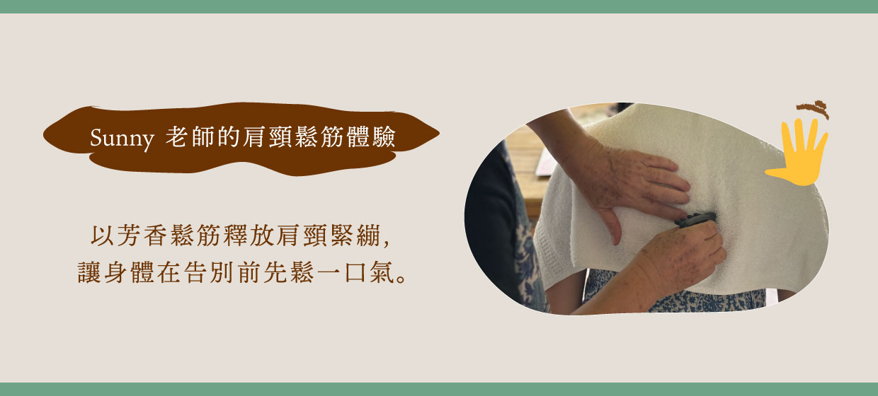 肯園資深芳療師Sunny,有著開朗的笑容與隨遇而安的心,她長住在台東,與聖母醫院團隊,一同深入偏鄉以芳療按摩提供長照、安寧服務。