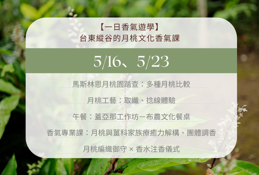 ○ 費用包含:馬斯林恩月桃園導覽、月桃取纖體驗、蓋亞那工作坊午餐、月桃芳療課、香水/酊劑課程材料費、月桃香囊手作