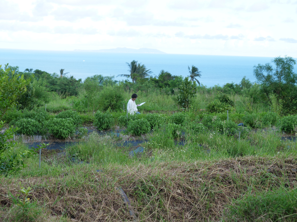 在農場倒數第二階,種了一叢叢的岩蘭草,一輪為抑制雜草,同時為土壤保溼,定期修剪岩蘭草後曬乾,舖蓋在土壤上,他說:「比起一般的乾草還要好用!」