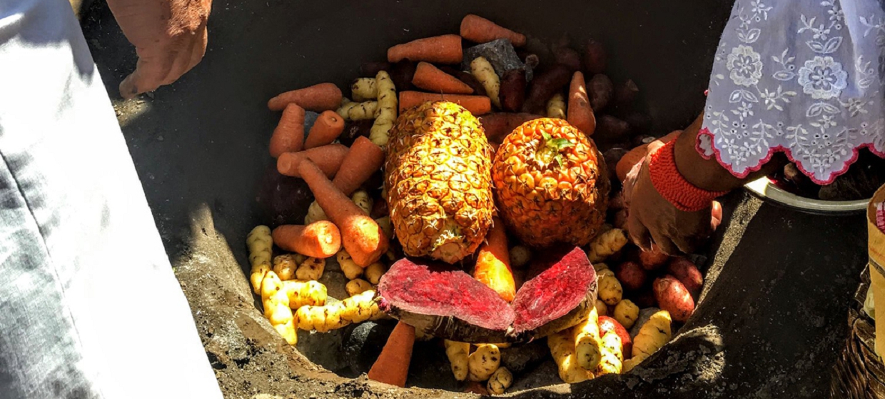 品嘗Pachacmanca古早料理,克丘亞語中的「大地烤爐」、「大地鍋」,這種料理的起源可追溯至印加帝國。等待食物在地底煮熟的過程裡,我們先參觀這裡神奇的藥草園,參觀完就可以享用大地鍋!