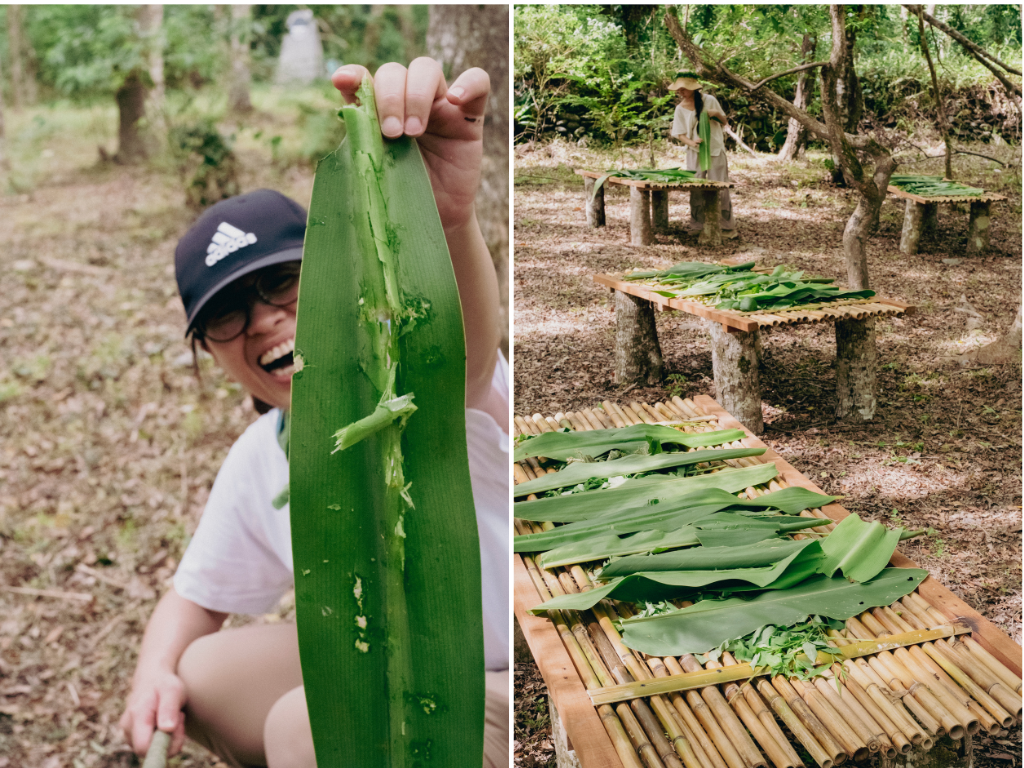 ●圖:部落夥伴歆詒帶著大家拿木棍敲打文殊蘭葉片,因文殊蘭的葉梗堅硬,破壞其結構除了使氣味釋放外,用來舖床也會躺得更舒適!