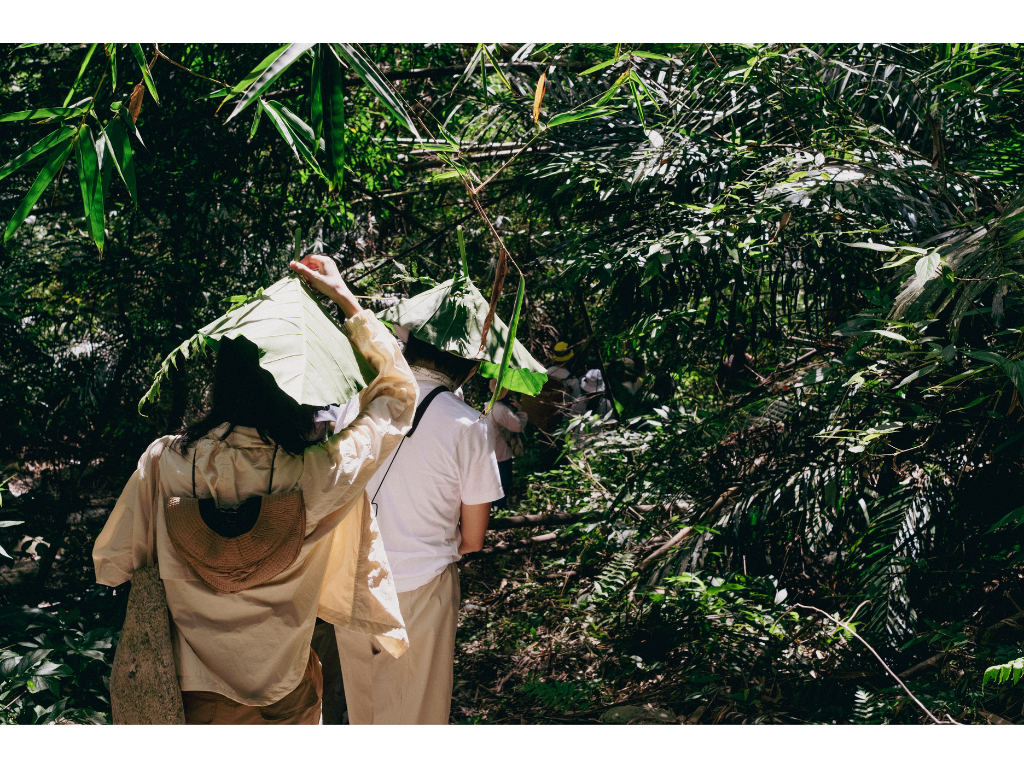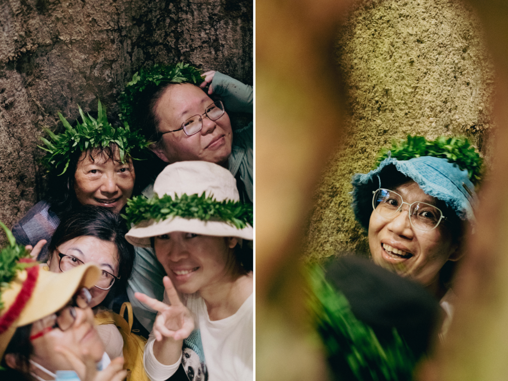 走著走,杰哥請每個人手一片姑婆芋葉,再採摘蕨葉,教大家製作葉子帽。葉子帽讓大家的心返樸歸真,像孩子般笑鬧,突然變身成森林精靈。