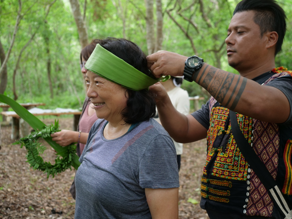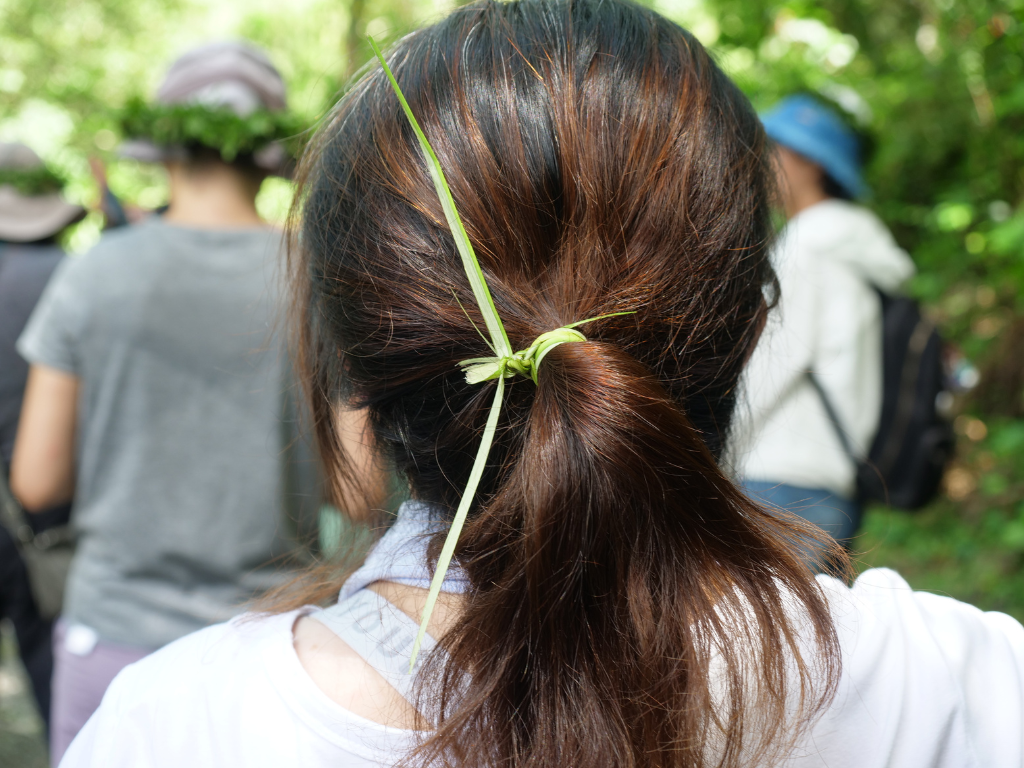 ●圖:學員聽完杰哥介紹立刻應用,拿未展開的山棕嫩葉綁頭髮。