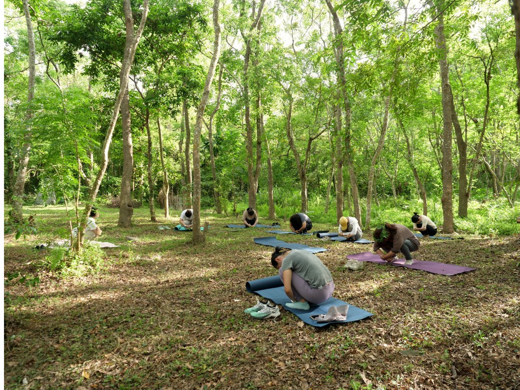 芳療師 Levi 帶著大家在森林中靜心,舒展筋骨,好迎接下一階段的藥草竹床薰蒸。
