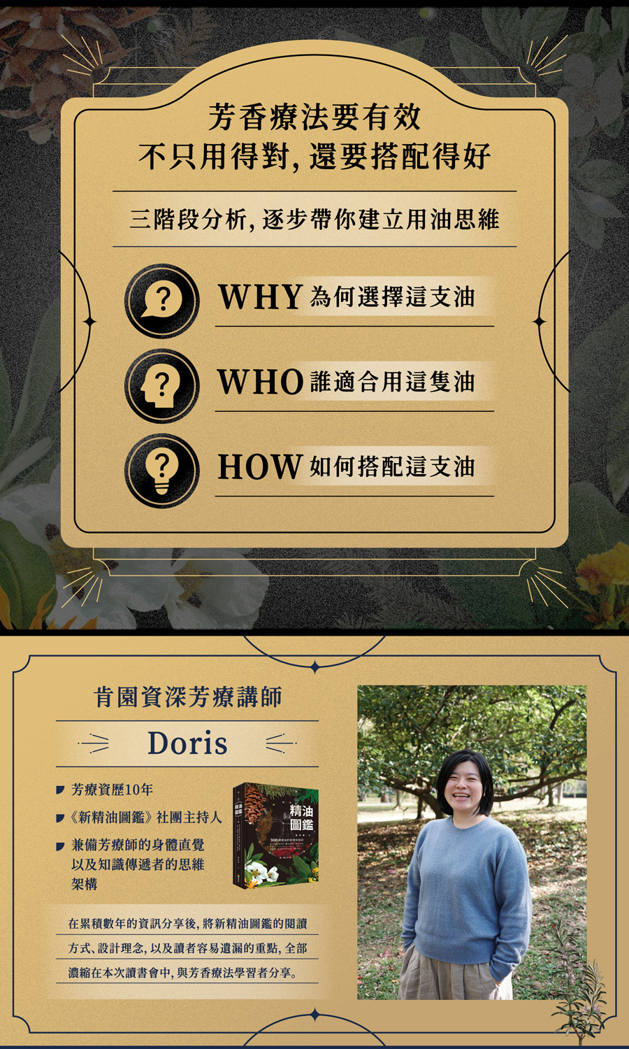 近年來,他更致力於深耕精油知識社群。隨著《新精油圖鑑》問世,他接下社團內容策劃的重任,維持每週一篇文的高頻產出;除了分享新興精油的實務應用,也順應時序更迭,提供貼合當下需求的香氣處方。他對香氣植物的洞察與專業見解,始終站在芳療相關學習資訊的最前線。